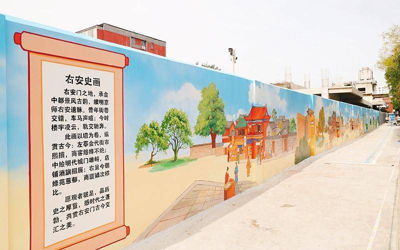 《右安史画》由丰台区右安门街道办事处组织创作,这幅 55 米长的彩绘墙以右安门城门为视觉中轴,左侧铺展金中都与明京城的繁华市井股神配资,景风门、中都水关、右安门等历史地标错落点缀;右侧则勾勒右安门街道的现代化风貌,中国出版集团、北京南站、京印国际中心、西铁营万达等当代地标鲜活呈现。作品通过精妙的构图设计与视觉引导,让古路与今道在城门处自然交汇、时空叠合,营造出 “一步跨千年”的沉浸式穿越体验。